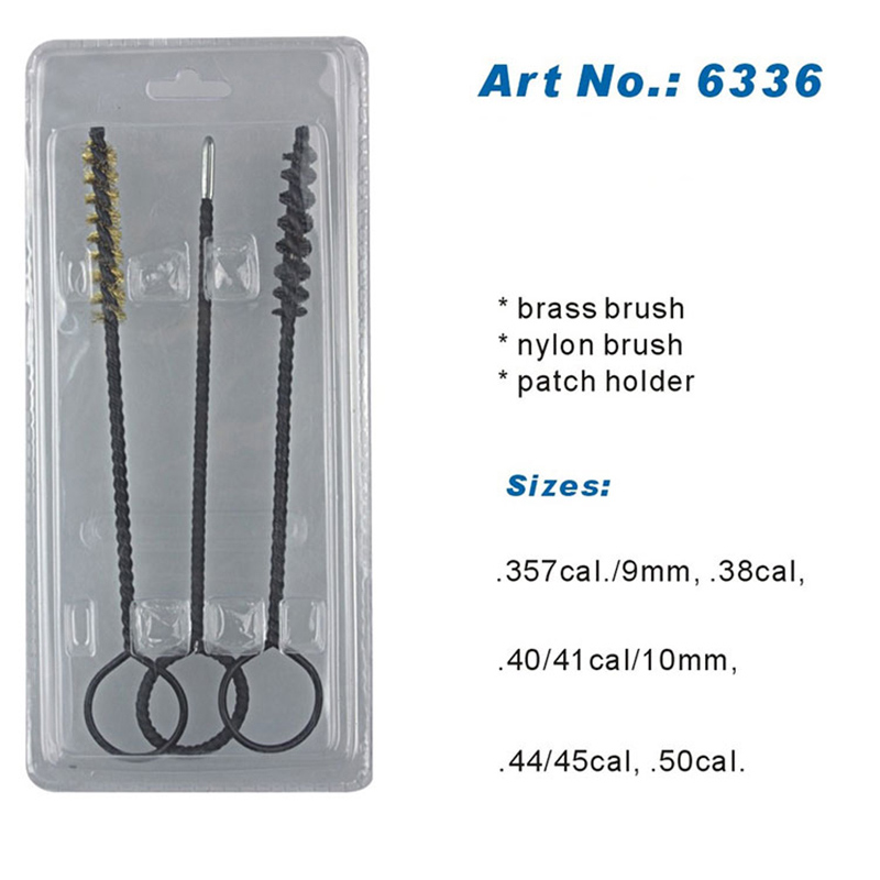 3 pieza pistola garbitzeko kit, blister bikoitzean bilduta. Letoizko zuloa garbitzeko eskuila bat, nylonezko zuloa garbitzeko eskuila bat eta zirrikitudun adabaki euskarria. Eskuragarria eta eraginkorra.
