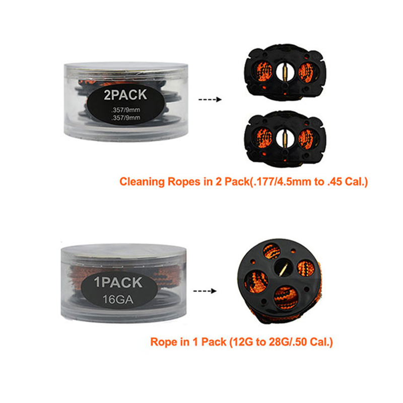 ● Pistola garbitzeko sokak estu josten dira, ez dira erraz hautsiko; Zuntz sintetikoko sokak eskuila duen barnean zuloa azkar eta eraginkorra garbitu dezake. Kalibrearen zenbakia laser bidez inprimatuta dago muturreko azkoin bakoitzean. Sokak garbigarriak dira berrerabiltzeko.