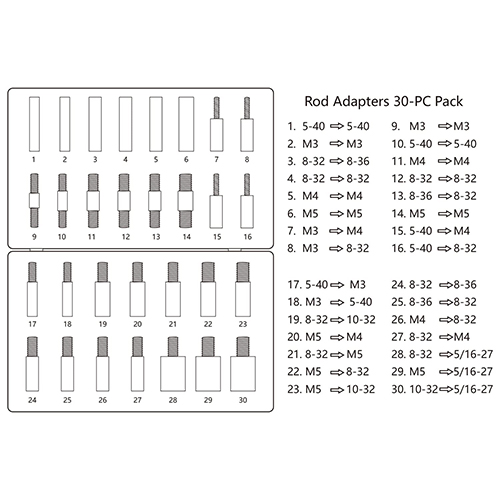 Pistola garbitzeko haga egokitzeko egokitzaileak 30 pieza paketea 5-40 8-32 10-32 5/16-27 M3 M4 M5 hariak haga ar eta eme konektorean