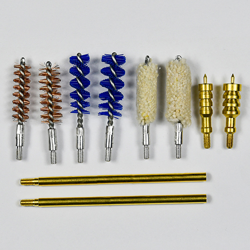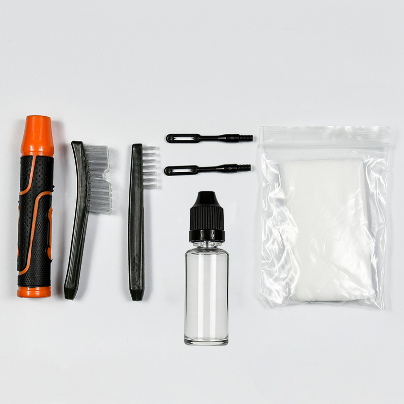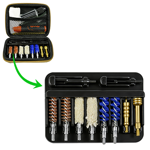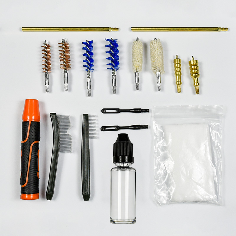Pistola garbitzeko kitak 2 tamaina ditu (9 mm eta .45 cal.). OX oihal estalia PVC-ko zorroa kremailerarekin. Letoizko eskuilak, kotoizko fregonak, nylonezko eskuilak, letoizko eskuilak, 2 hagaxka. Harea eta kolore beltza aukeran.