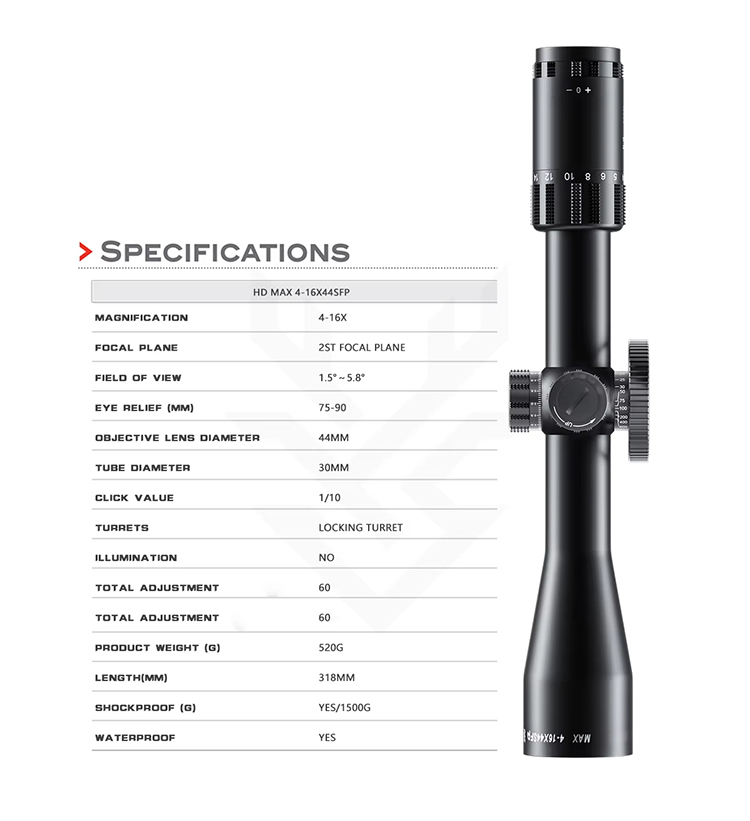 HD MAX 4-16X44SFP HD lente handiko ehiza teleskopio monokularra handizkakoa