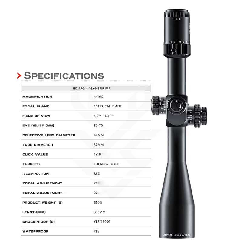 Optika HD PRO 4-16X44 SFIR FFP Shock Erresistentzia Handiko Ehiza Ehiza Irte luzeko jaurtiketa taktikoa 30 mm-ko tutua