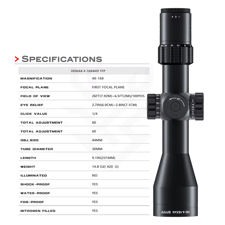 MAX 4-16X44SF FFP HD lente handiko ehiza teleskopio monokularra handizkakoa