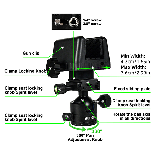 OEM CNC aluminiozko 360 graduko bola-burua tiro-jarraiaren atsedena ehizarako tiro-makila monopodoa tripodea