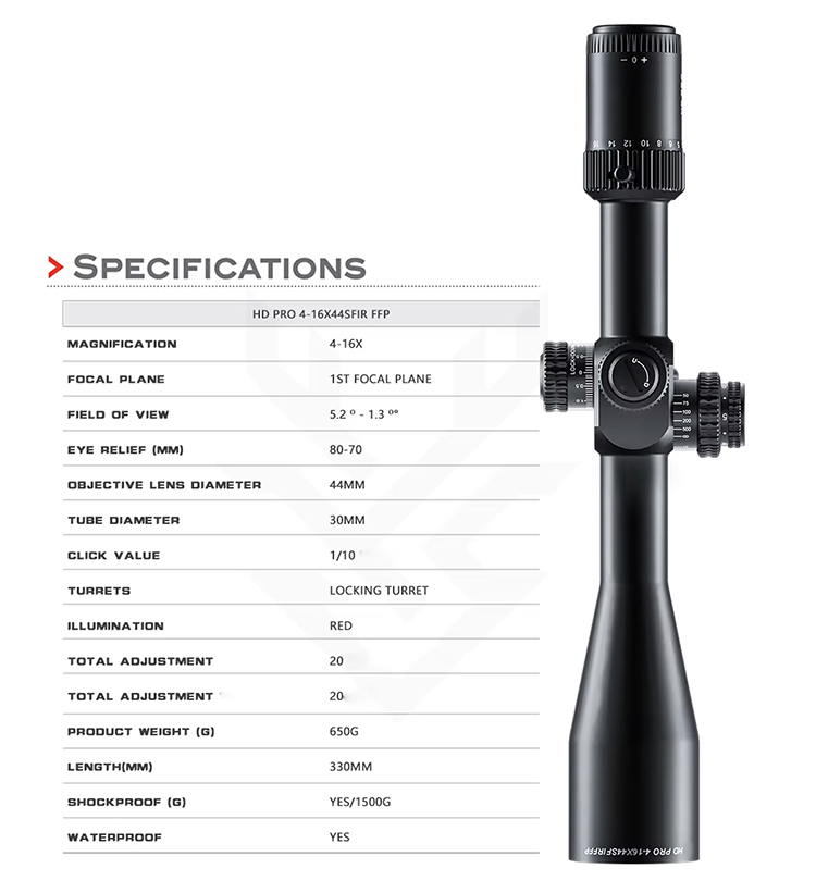 Optika HD PRO 4-16X44 SFIR FFP Shock Erresistentzia Handiko Ehiza Ehiza Irte luzeko jaurtiketa taktikoa 30 mm-ko tutua