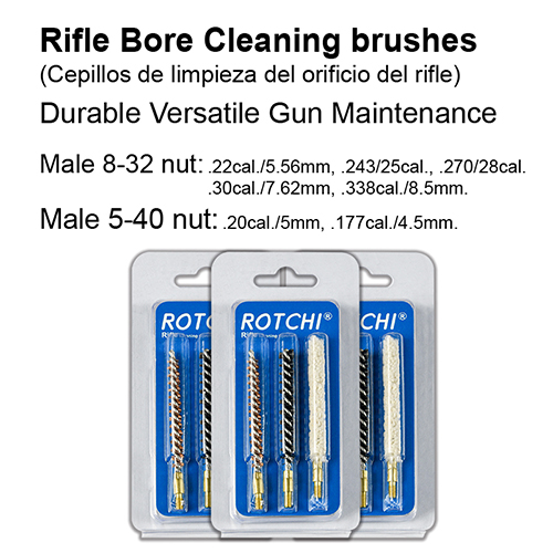 Fusil-zuloa garbitzeko eskuila 3-in-1 multzoa, blistera eta txartelaren paketea. Eskuragarri dauden neurriak: .177, .22, .25, .27, .30, .338 cal.