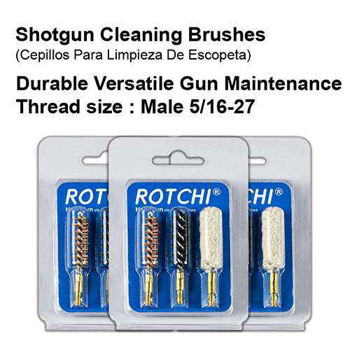 Eskopeta-zulo garbitzeko eskuila 3-in-1 multzoa, blistera eta txartela paketea. Eskuragarri dauden neurriak: 12G, 16G, 20G, 410